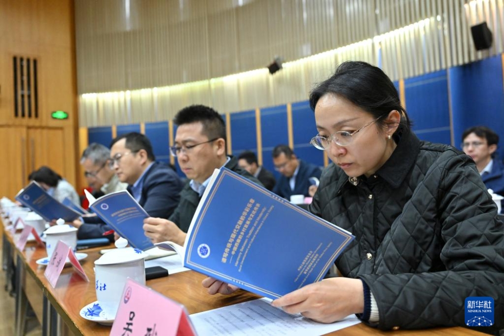 10月16日,在北京举行的“西藏的乡村发展与文化传承”专家座谈会上,与会嘉宾翻阅《谱写传统与现代交融的华彩乐章——中国西藏的乡村发展与文化传承》智库报告。新华社记者 李鑫 摄