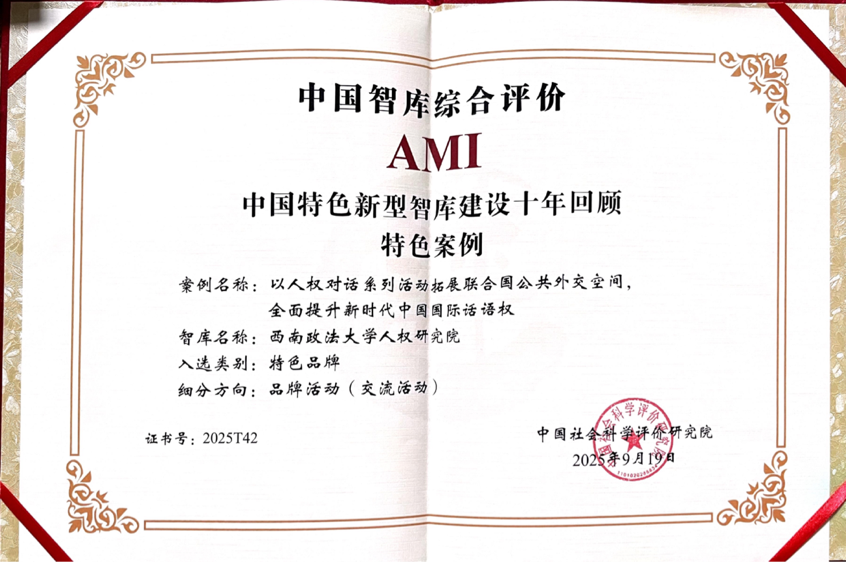 2025年9月19日,在中国社会科学评价研究院主办的“中国智库综合评价(AMI)”评选中,西南政法大学人权研究院《以人权对话系列活动拓展联合国公共外交空间,全面提升新时代中国国际话语权》入选“中国特色新型智库建设十年回顾特色案例”,获评特色品牌·品牌活动(交流活动)。