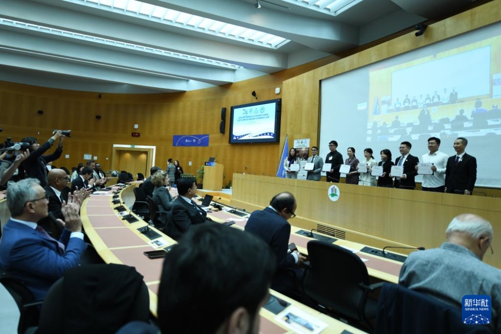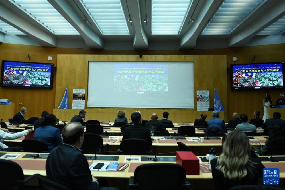 这是11月5日在瑞士日内瓦世界气象组织总部拍摄的第二十届“新可持续城市与人居环境奖”颁奖现场。新华社记者 连漪 摄