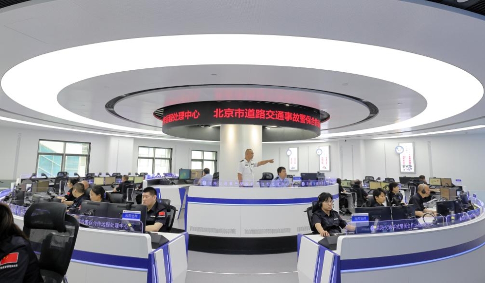 2025年5月23日,在北京市公安局交管局北京道路交通事故警保合作远程处理中心,事故处理支队支队长于海涛(中)和民警在统筹调度全市轻微交通事故警情远程处置工作。新华社记者 殷刚 摄