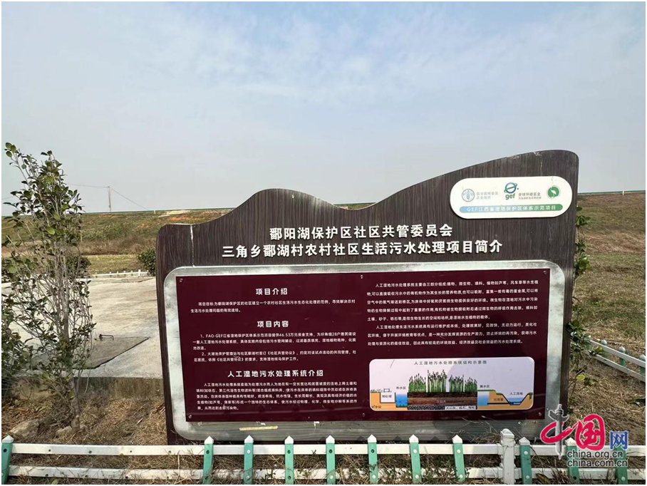 鄱湖村农村社区生活污水处理项目是全球环境基金江西湿地保护区体系示范项目的子项目,在永修县三角乡鄱湖村为28户居民建设的一套人工湿地污水处理系统。该人工湿地采取土壤和砾石混合组成填料床,并在床体表面种植芦苇、美人蕉等水生植物,使生活污水经过物理、化学、微生物分解等共同作用,从而让氮、磷等营养物质被分解,既减少了农村生活污水向周边湿地排放,也改善了农村居住环境,对保护好湿地生态环境和候鸟栖息地具有重要作用,既提升了清洁和健康环境权的保障水平,也促进了生态环境可持续发展。