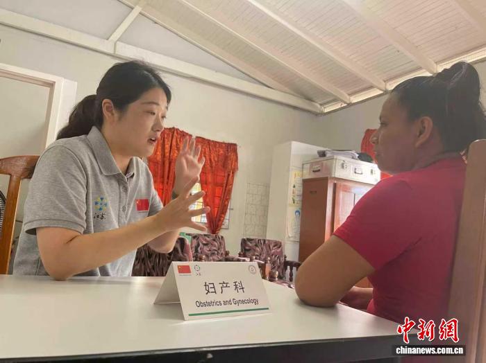 妇产科李妍雨医生给当地患者进行咨询。第21期援圭亚那中国医疗队供图