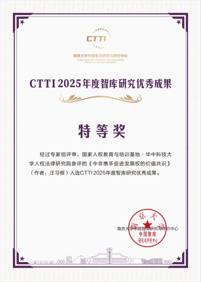 近日,南京大学中国智库研究与评价中心发布了中国智库索引CTTI2025年度智库建设最佳案例与智库研究优秀成果推介名单。国家人权教育与培训基地·华中科技大学人权法律研究院的研究成果《中非携手促进发展权的价值共识》(作者:汪习根)获评CTTI2025年度智库研究优秀成果特等奖。该成果曾于《光明日报》2025年8月22日第12版【特别关注】栏目刊发。