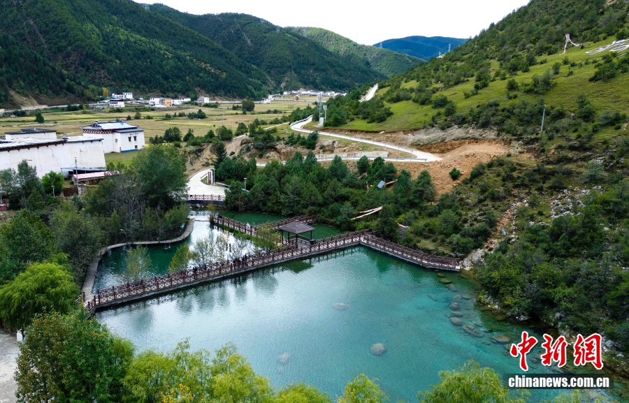 2025年9月18日,四川省乡城县热打镇围绕尼丁峡谷旅游景区等资源特色,打造优质景观带,助力乡村振兴。图为尼丁峡谷谷口的水塘与白藏房相映成景。 中新社记者 王磊 摄