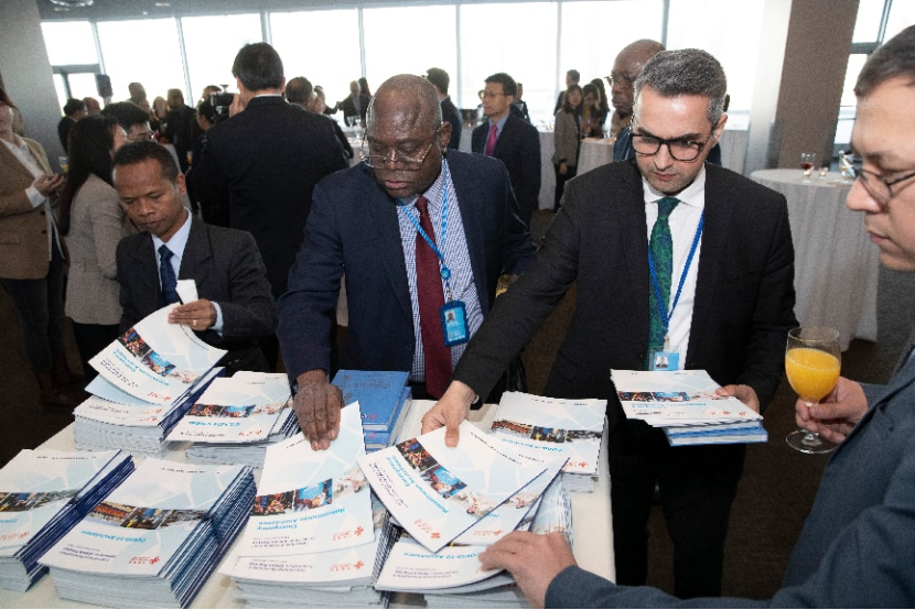 当地时间2023年4月19日,“全球发展倡议新进展可持续发展议程新行动”主题展览在纽约联合国总部举行。图为与会嘉宾取阅国合署发布的新报告——《国际发展合作的中国实践》。 中新社记者 廖攀 摄
