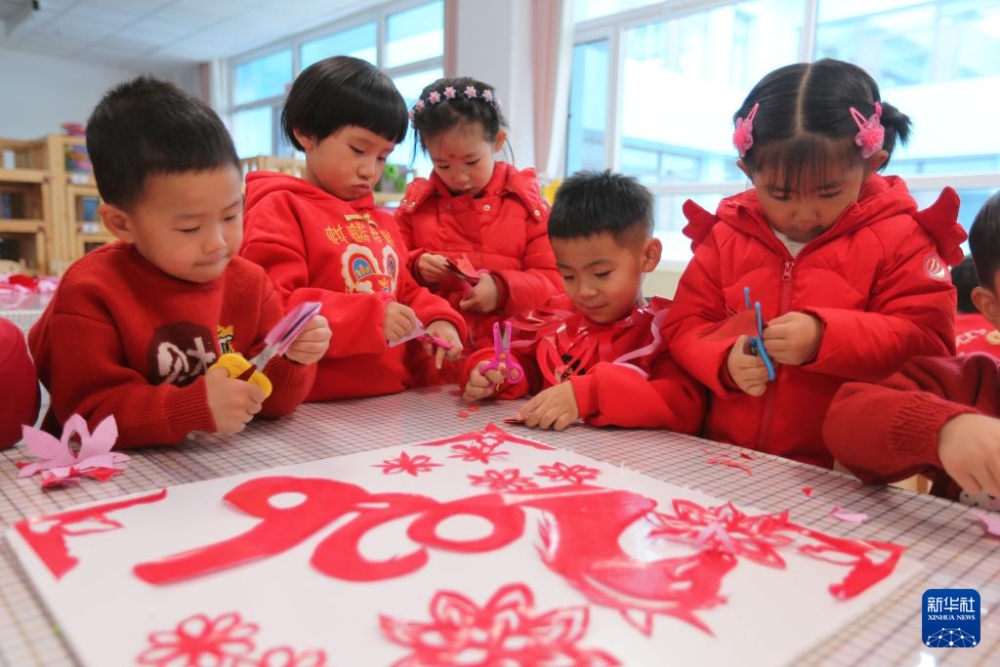 12月29日,河南省焦作市温县第三幼儿园的小朋友在进行迎新年剪纸创作。新华社发(黄福兴摄)