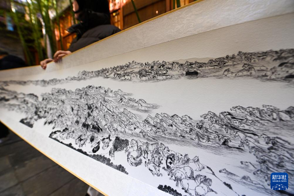 这是12月29日在天津古文化街“喜迎马年,五代画马人马画艺术展”上拍摄的画家宫春虎的作品《万马图》(局部)。新华社记者 赵子硕 摄