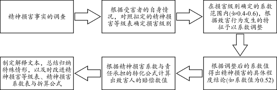 第一,针对附带人身损害的精神损害,我国需要确立专门的环境侵权精神损害认定规则,以司法解释的方式加以规范化,或是充实《最高人民法院关于确定民事侵权精神损害赔偿责任若干问题的解释》等已有规范的认定规则,以发挥理想的引导作用。一方面,我国可参照域外对精神损害的分级经验,将环境侵权精神损害与医学鉴定结论相结合。例如,视受害者的生活、工作状态与心理测验结果,将相应的精神损害分为“足以影响生活的精神焦虑、可被医学认定的精神创伤、可逆转的精神疾病、不可逆转的精神疾病”等级别,不同级别内部也可视医学诊断结论而区分出若干子级,从而与非精神损害分离,避免片面依照普通伤害标准而掩盖精神损害的特质。另一方面,对医学领域已经确认的精神损害级别结论,需要考虑修复相应损害所需要的环境条件及受害者的精神状态恢复规律,得出与责任程度直接对应的精神损害系数。在将相应系数折算为精神损害赔偿量的过程中,应当注意设定合理的赔偿上限与下限,避免因为倍数效应而导致赔偿负担过重或过轻。具体而言,可由医学工作者、司法工作者、社会学专家、心理学专家等群体共同评估不同级别的精神损害,综合得出损害数值。例如,对最严重的精神损害情形,损害赋值为1;对完全没有受到干扰的情形,损害赋值为0。其余级别的精神损害可在此区间内,根据所属的损害情形与恢复难度,被赋予不同的损害值。特定的敏感因素(如受害者的年龄、性别、被破坏环境的生态地位)可作为额外考虑的升值条件,在合理的情况下添加,进而根据该系数,折算出需要赔付的金钱数额(流程见图1)。