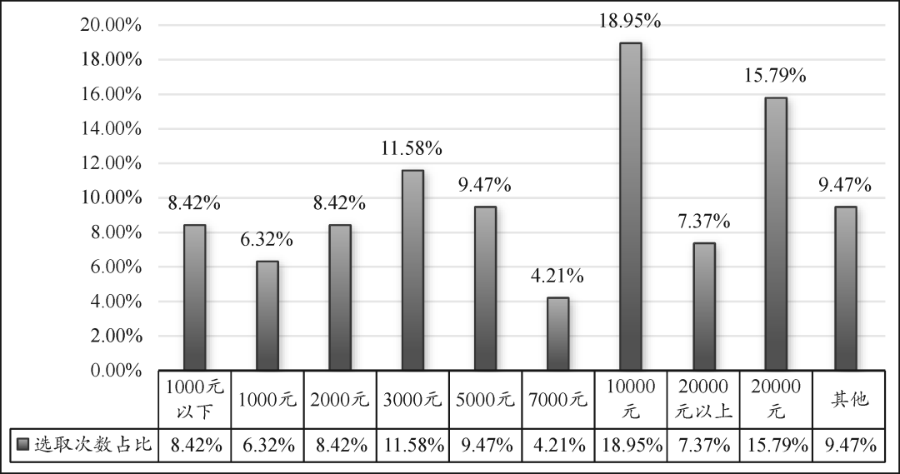 在责任标准上:一方面,人民法院进行精神损害赔偿裁判时尚无精神损害责任数额的计算公式或表格,往往是选取几个固定的赔偿数额加以判断。根据检索到的600余份裁判文书,排除驳回原告起诉的裁判,在剩余文书中可粗略统计出认可数额的概率(见图2)。从中不难发现,我国人民法院认定精神损害赔偿一般选取1000元、2000元、3000元、5000元、10000元、20000元等数额,而不同数额所对应的精神损害并未形成科学的梯度差距,由此产生相应责任的认定是否客观不无疑问。即使在案件情形几乎完全相同、仅存在主体区别的案件中,人民法院也可能认定不同的赔偿数额,这更容易引发赔付者乃至第三方的不满。值得注意的是,人民法院一般只对造成死亡或广泛严重后果的伤害者判处20000元以上的精神损害赔偿,显然不足以弥补受害人一方的实际损失。除此以外,对3000元、5000元甚至7000元的赔偿数额,所对应的损害情形很难区分出实际损害的强弱;在部分案件中,人民法院判处明显处于不同损害状态的主体以相同的赔偿额度,采取判决总赔偿额后均分的方式处理纠纷。