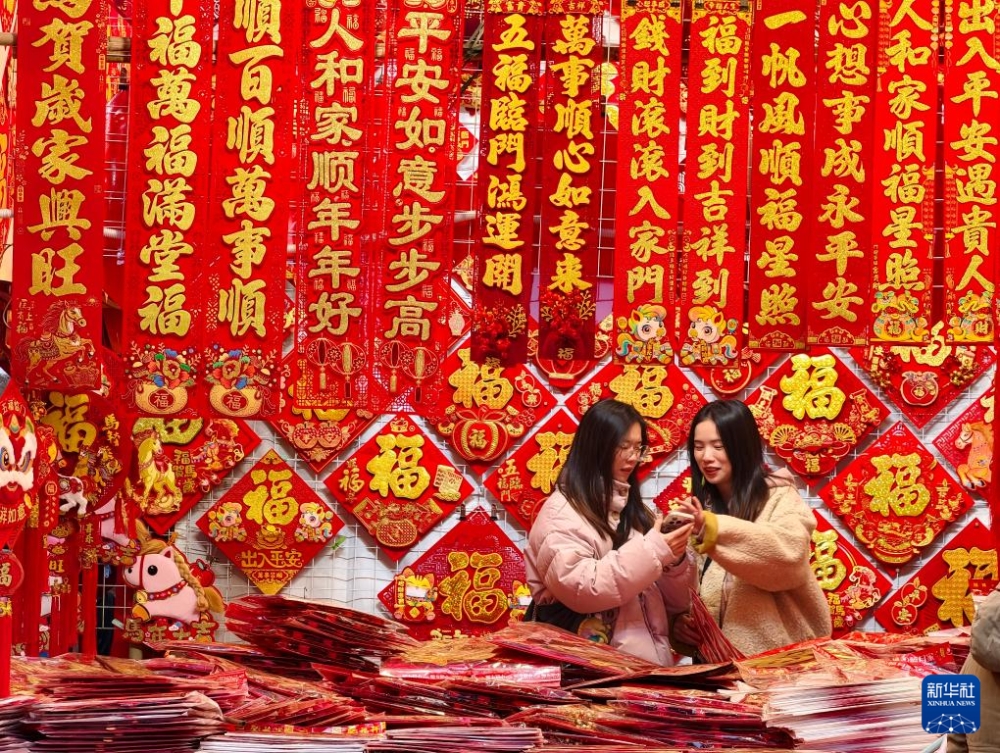 1月25日,顾客在河南省焦作市温县赵堡镇赵堡村年货市场选购春联、年画。新华社发(徐宏星摄)