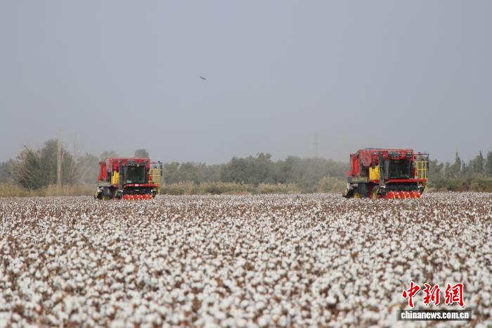 新疆巴音郭楞蒙古自治州尉犁县一处棉田内,大型采棉机正在作业。苟继鹏摄