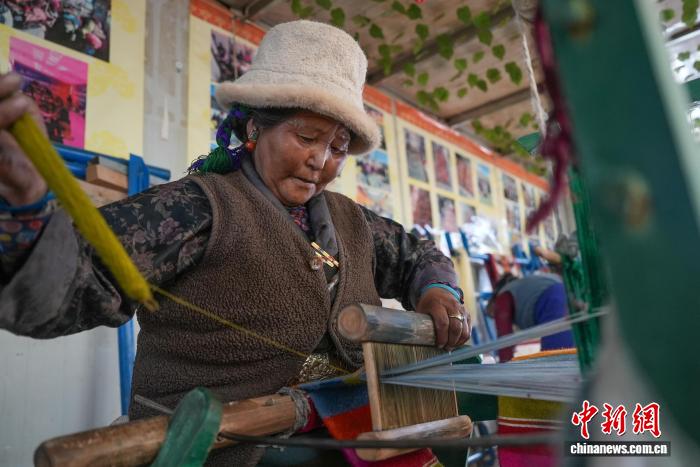 图为合作社员工旦卓正在编织邦典(藏式围裙)。贡确 摄