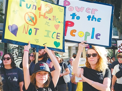 不久前,人们在美国加利福尼亚州洛杉矶市政厅前手举标语参加示威活动,抗议美国联邦当局对移民暴力执法。曾慧 摄(新华社发)