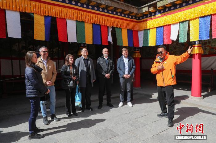 4月5日,青海西宁,奥地利中国友好协会高级代表团一行先后前往藏传佛教圣地塔尔寺和青海省藏医院感知青海藏文化。图为代表团成员参观塔尔寺。中新社记者 马铭言 摄