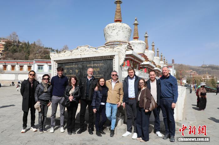 4月5日,青海西宁,奥地利中国友好协会高级代表团一行先后前往藏传佛教圣地塔尔寺和青海省藏医院感知青海藏文化。图为代表团在塔尔寺合影。中新社记者 马铭言 摄