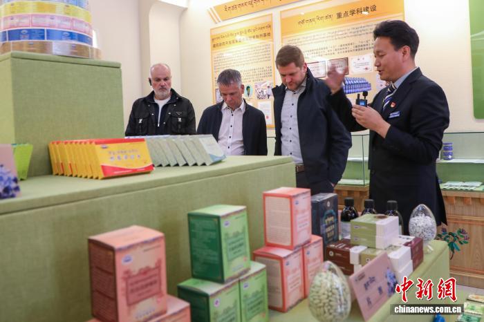4月5日,青海西宁,奥地利中国友好协会高级代表团一行先后前往藏传佛教圣地塔尔寺和青海省藏医院感知青海藏文化。图为代表团成员了解青海省藏医院研制的藏药。中新社记者 马铭言 摄