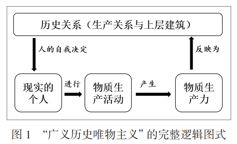 可以依据“广义历史唯物主义”构造出历史唯物主义的完整逻辑图式,且应把握两个关键要点:第一,这个逻辑图式的起点必须是作为主体的“人”,具体而言,是进行物质生产活动的“现实的个人”;第二,既然物质生产活动是人的活动,也就表明作为“物质力量”的生产力与经济关系,只能是人的创造物和客体。