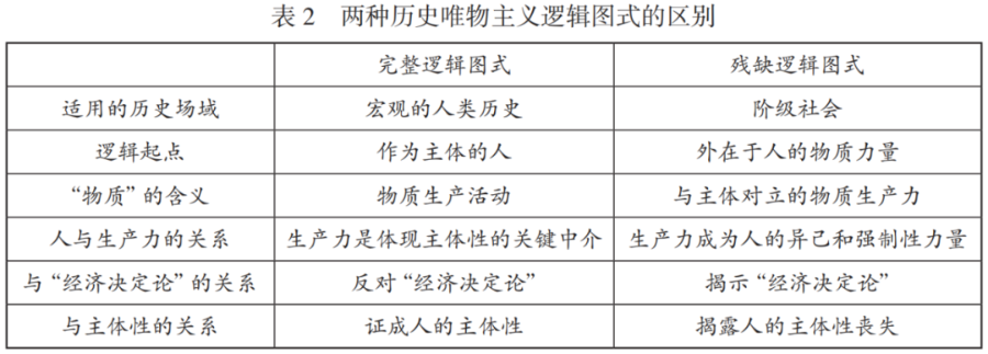 大体而言,历史唯物主义的两种逻辑图式存在三个维度上的区别:第一,从价值判断与事实判断之区分的角度来看,完整逻辑图式具有事实判断和价值判断的统一性,其反映的是人类历史的本然面貌,以及实现了“人的解放”之未来历史的理想状况;残缺逻辑图式是用以解释“物质力量颠倒决定人”现象之本质的事实判断,并服务于批判性的价值判断目的。第二,从其与“经济决定论”的关系来看,完整逻辑图式表明,历史唯物主义绝非“经济决定论”,“经济决定论”只有在残缺逻辑图式的意义上才得以成立。第三,从人的主体性问题来看,完整逻辑图式将“人”作为出发点和归宿,是对人的主体性的高扬,彰显着鲜明的人权理想;而残缺逻辑图式则反映出人在现实历史中丧失了主体性,即物质力量篡夺了人的主体地位,成为历史进程的根本决定性要素。