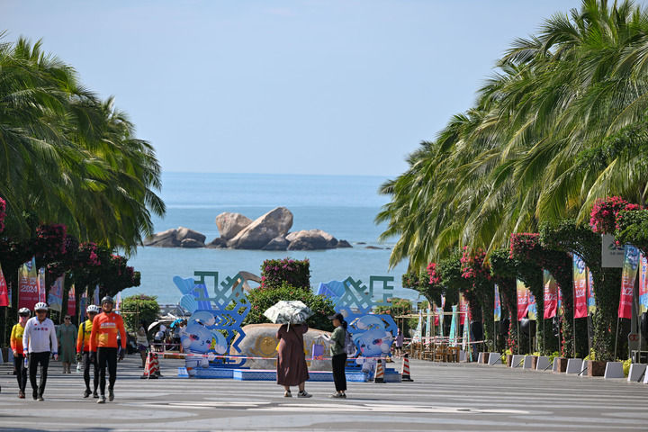 2024年11月19日,游客从位于三亚天涯海角游览区的运动会吉祥物前经过。新华社记者 陈泽国 摄