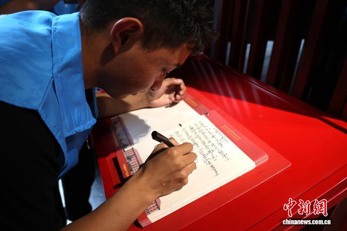 图为青海玉树藏族学子在留言簿上用藏语写下美好祝愿。张海雯 摄