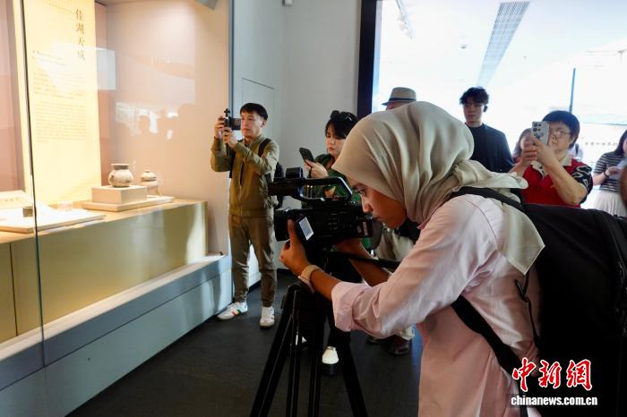 图为外籍嘉宾拍照记录西湖博物馆展品。中新社记者 刘子琳 摄