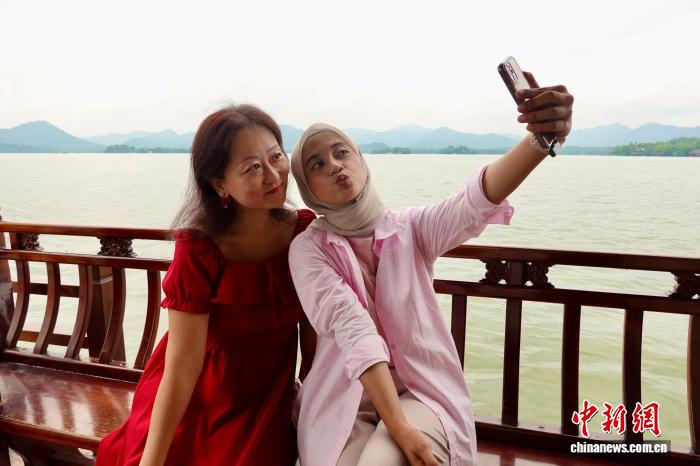 图为中外嘉宾在西湖拍照留念。中新社记者 刘子琳 摄