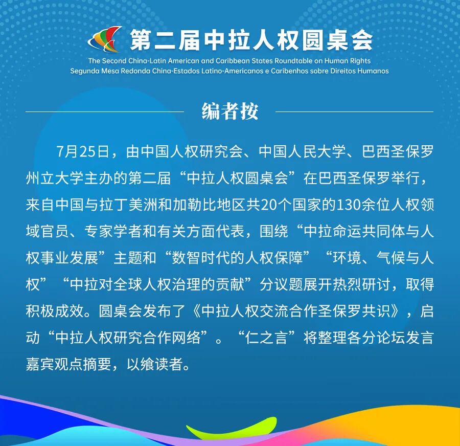 环球时报副总编辑 白龙:绿色发展与人类幸福感、安全感及人权相关。一些西方国家主张的环保口号和标准,正成为一种牺牲其他国家发展权利的“人权双标”,是对全球南方人民生存权、发展权的漠视,是一种“文化霸权”。文化具有多样性,人权具有实践性,而西方的人权观不是人权概念的唯一来源。中国和拉美国家应携起手来,跳出人权政治化叙事,从绿色发展视角讲好中拉人权故事,让中拉命运共同体的大树枝繁叶茂,不断向上生长。