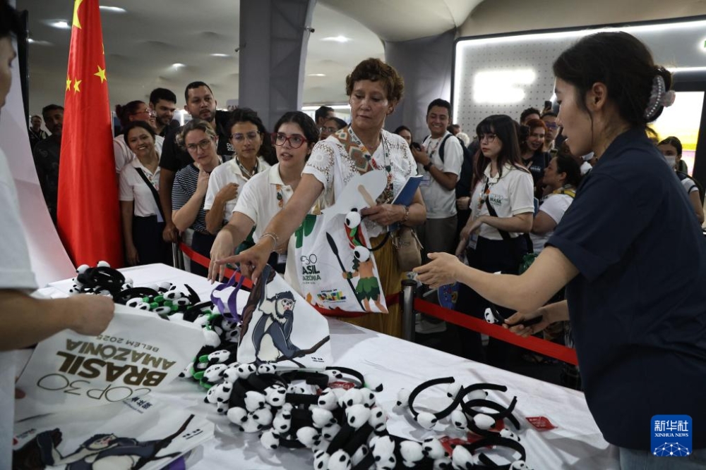 11月10日,在巴西贝伦,与会代表在COP30“中国角”领取纪念品。 新华社发(克劳迪娅·马尔提尼 摄)