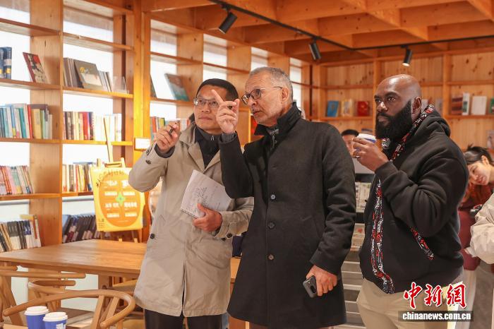 图为中外嘉宾在湖陂村的灵感书屋参观调研。中新社记者 刘力鑫 摄
