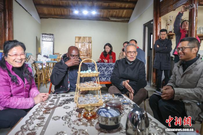 图为中外嘉宾走进“新村民”刘红(左一)家中,大家一边喝茶一边交流。中新社记者 刘力鑫 摄