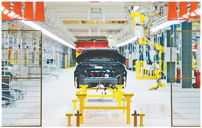比亚迪巴西乘用车工厂首车下线仪式今年7月1日在巴西巴伊亚州卡马萨里市举行。图为一辆比亚迪新能源汽车正在生产线上装配。本报记者 宋亦然摄