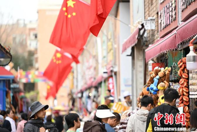 2025年9月23日,游客在新疆乌鲁木齐市大巴扎步行街游览、购物。中新社记者 田雨昊 摄