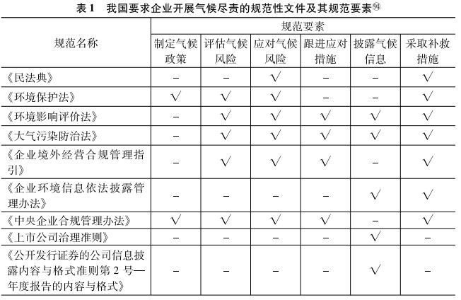 通过对我国在加强企业气候问责上的态度立场、敦促或要求企业开展气候尽责的规范性文件、企业气候侵权救济体系的梳理可以发现,中国政府高度重视企业在应对气候变化中的作用和潜力,并采取了一系列举措加强企业气候问责。虽然我国并未在企业气候责任相关规制实践中使用“气候尽责”术语,但上文分析表明,中国要求企业履行气候责任的各类规范已在不同程度上反映了气候尽责的规范要求(表1)。在此基础上依据国际标准评价我国企业气候责任规制实践,不仅有利于客观全面地把握我国企业气候责任治理现状、为持续提升我国企业气候责任治理效能提供参照依据,也有助于加快构建具有中国特色的“气候尽责”规范体系、更好地向国际社会分享中国企业气候责任规制经验与方案。
