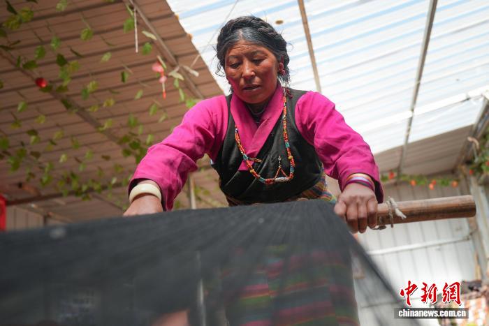 图为合作社员工旦卓正在编织邦典(藏式围裙)。贡确 摄