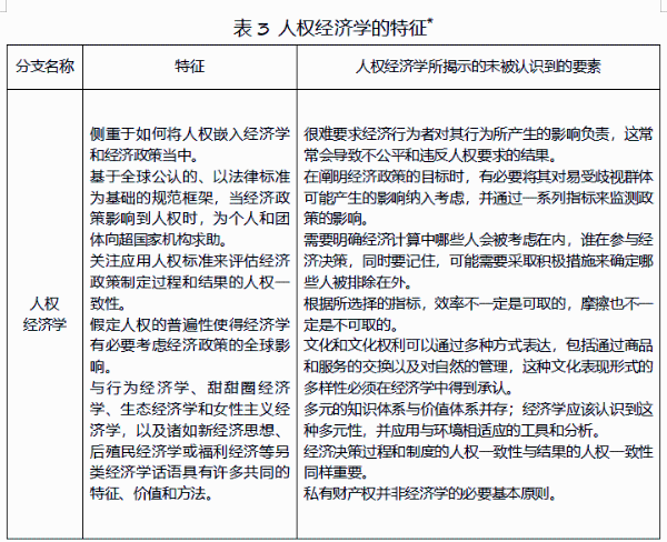 本文第一、二部分的讨论能够将人权经济学分支的内容填入表1。表3列出了人权经济学的特点和它所揭示的未被认识到的要素。将两者进行比较,可以发现人权经济学与其他经济学分支的共同之处。确定人权方法所揭示的要素只是开展人权经济学研究的第一步。下一步将是细化嵌入经济学中的不同人权要素。