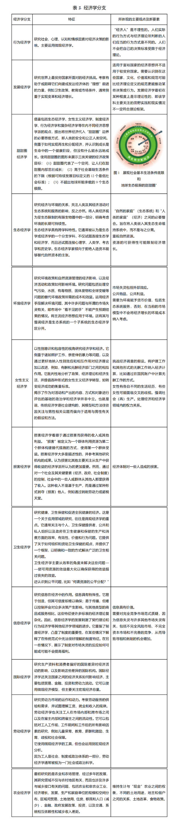 表1中所列分支展示了将特定主题作为经济学分支时所体现的一系列观点和目的。某些分支代表经济的一个方面或领域,并要求经济研究严格聚焦于该方面。教育经济学、卫生经济学及国际经济学都是如此。而其他分支则显然不同。比如,甜甜圈经济学的含义并非关注蛋糕;其名称通过甜甜圈的简单意象,阐明其以甜甜圈形状为框架提出的经济原理,并使其易于理解。换言之,甜甜圈经济学一名乃是一种强有力的宣传策略。其他分支则尝试为经济思维注入新的视角,并将该视角应用于经济的所有领域。生态经济学和女性主义经济学即为这些分支的典型代表。