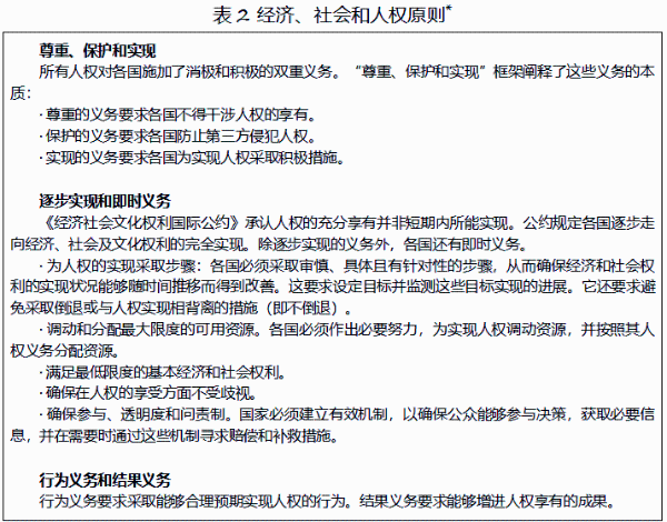 随着时间的推移,上述文书中规定的权利所产生的义务已经得到阐明和充实,其中,为监督各项公约和其他国际人权条约实施情况专门设立的专家机构,即条约机构,作出了突出贡献。此外,一些权利通过纳入区域性或独立的专题公约得到了进一步细化和发展。值得注意的是《儿童权利公约》,除美国外,世界上所有国家和地区均签署并批准了该公约。表2展示了主要的人权原则。