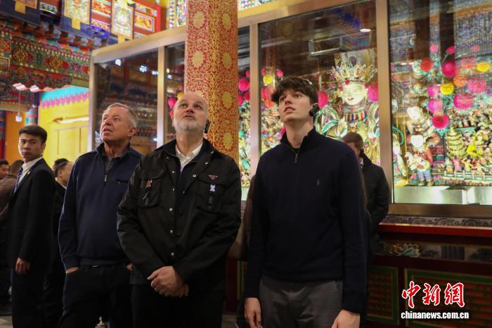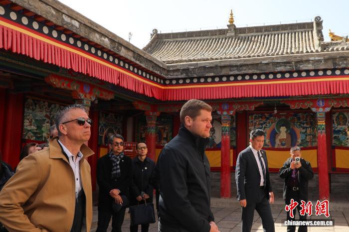 4月5日,青海西宁,奥地利中国友好协会高级代表团一行先后前往藏传佛教圣地塔尔寺和青海省藏医院感知青海藏文化。图为代表团成员参观塔尔寺。中新社记者 马铭言 摄