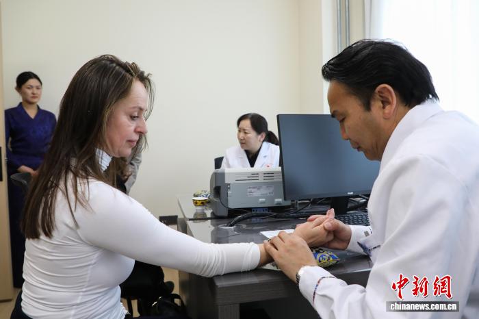 4月5日,青海西宁,奥地利中国友好协会高级代表团一行先后前往藏传佛教圣地塔尔寺和青海省藏医院感知青海藏文化。图为代表团成员(左)在青海省藏医院体验特色诊疗。中新社记者 马铭言 摄