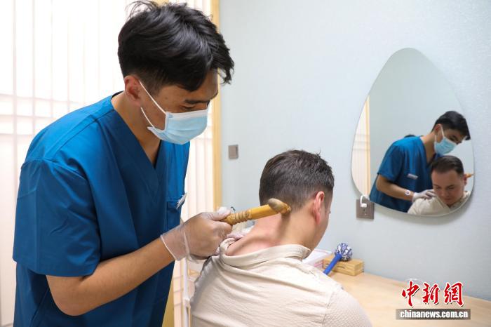 4月5日,青海西宁,奥地利中国友好协会高级代表团一行先后前往藏传佛教圣地塔尔寺和青海省藏医院感知青海藏文化。图为代表团成员体验藏医尤阙疗法。中新社记者 马铭言 摄