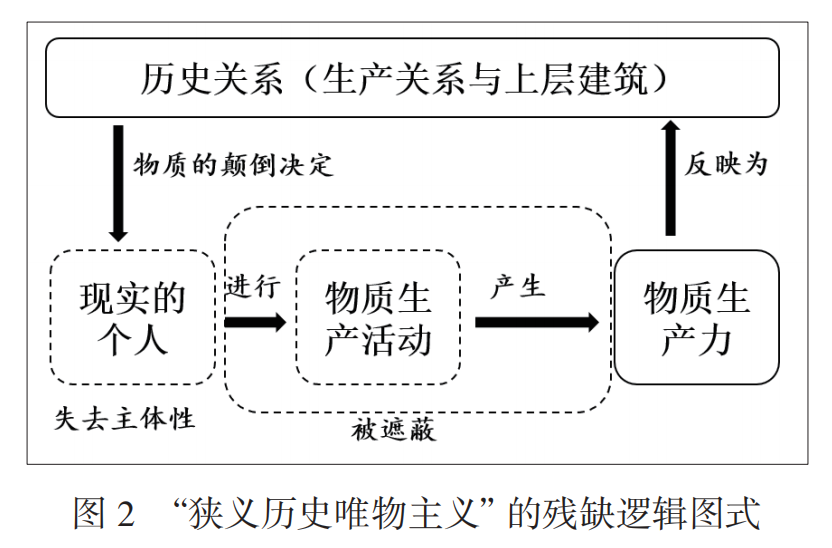“狭义历史唯物主义”表现为一种历史唯物主义的残缺逻辑图式。因为在其中,“人”在逻辑原点的位置上被隐去了,甚至被置于“物质生产力”这一中介环节之后,故“物质生产力”表现为一种与主体相分离的物质力量。造成这种残缺的原因在于“分工”。《德意志意识形态》指出,生产力、社会状况和意识“彼此之间可能而且一定会发生矛盾……而要使这三个因素彼此不发生矛盾,则只有再消灭分工。”这里的要“消灭”的“分工”实际上指“受迫性分工”,这种分工将人们限定在强加的、不可逾越的社会活动范围内,导致“社会活动固定化”,使每一个人都不再能把握生产过程的全貌,从而遮蔽了“人创造生产力”这一事实。如伊西多尔·瓦利曼指出,“受迫性分工的存在,乃是导致异化状态的根本原因;相反,共产主义制度下的自愿分工,则创造了非异化的条件。”由此,在残缺逻辑图式中,“物质生产力”及其基础性作用,便表现为异化的形式,即作为客体的“物质生产力”,脱离并压制了作为主体的人。
